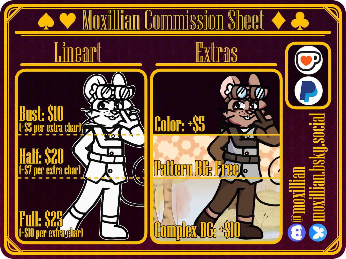 Payment upfront or (pay half in the beginning of the drawing and half after finished, if necessary.)I only accept payment on PayPal & Ko-FiI specialize more on character art, I don't have much experience on mechas, but, protogens and alike fine!Edits are okay, but if too many are requested I will charge for it.Refunds and Cancels cannot occur after the art is finished.I can decline any commission request, if uncomfortable.Once the commission is over, you can post it in your socials! (I will just require you to credit me and not to trace over it/claim it as your own.)If you have any other questions about anything, shoot me a DM!